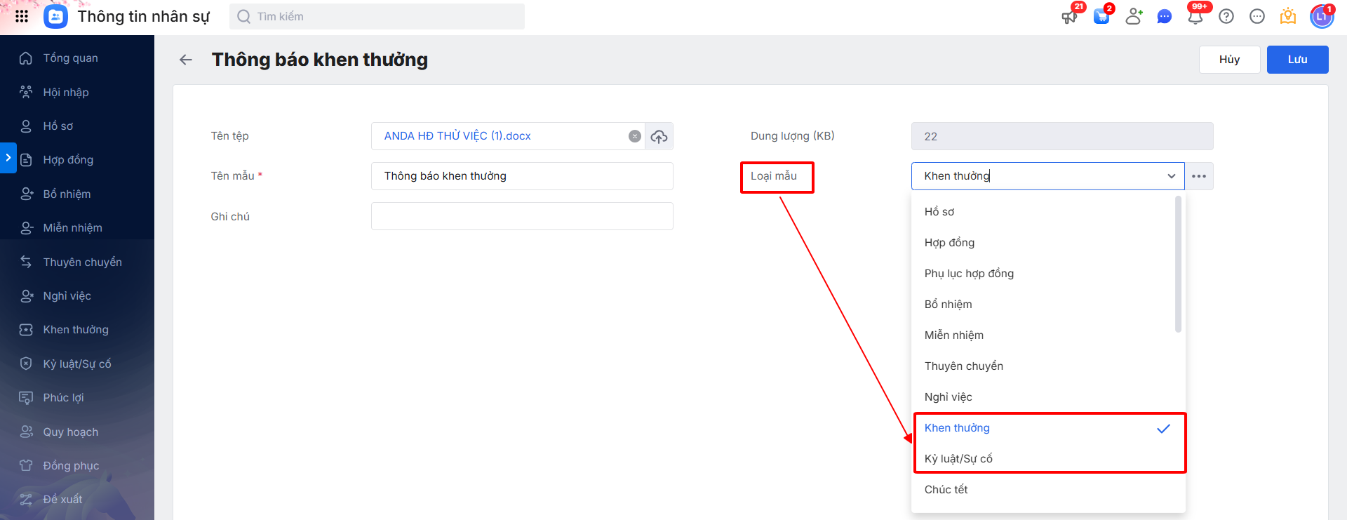Bước 3: Tại chi tiết Mẫu văn bản \ nhấn Sửa \ mục “Loại mẫu” chọn loại phù hợp để có thể tạo được văn bản trên phân hệ tương ứng (Khen thưởng hoặc Kỷ luật/Sự cố) \ sau đó nhấn Lưu.