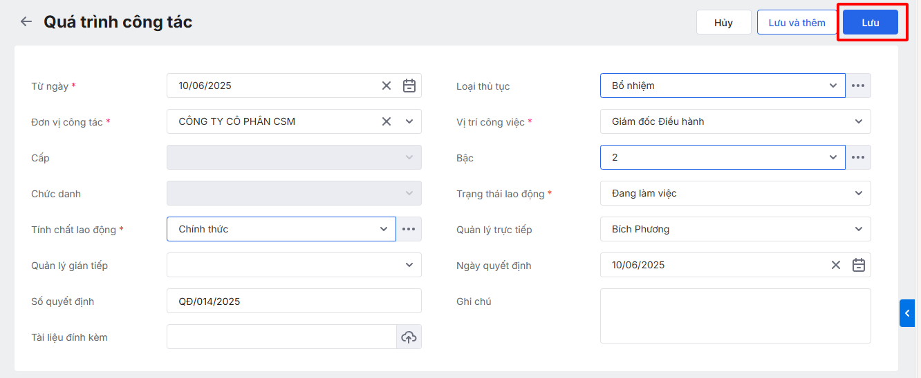 - Các thông tin mới trong quá trình công tác như đơn vị công tác, vị trí công việc, tính chất lao động, quản lý trực tiếp, … sẽ được tự động cập nhật tương ứng trong thông tin công việc