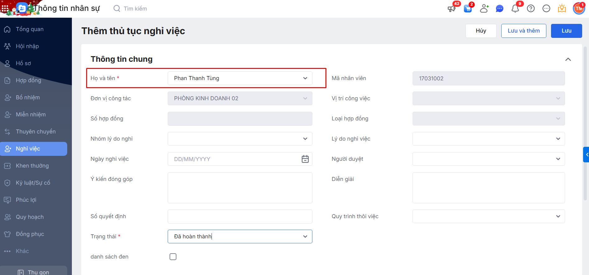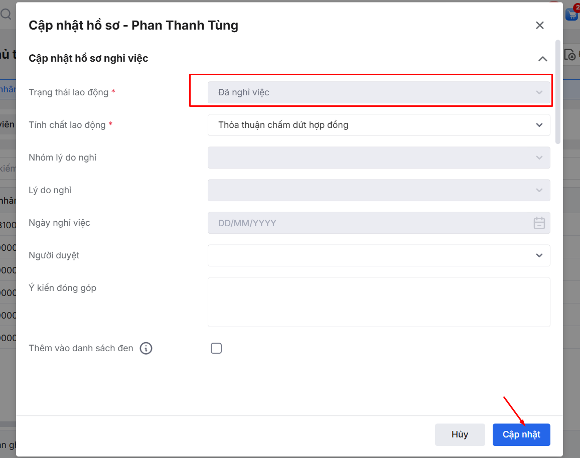 Bước 3: Cập nhật hồ sơ nhân viên với trạng thái lao động về “Đã nghỉ việc