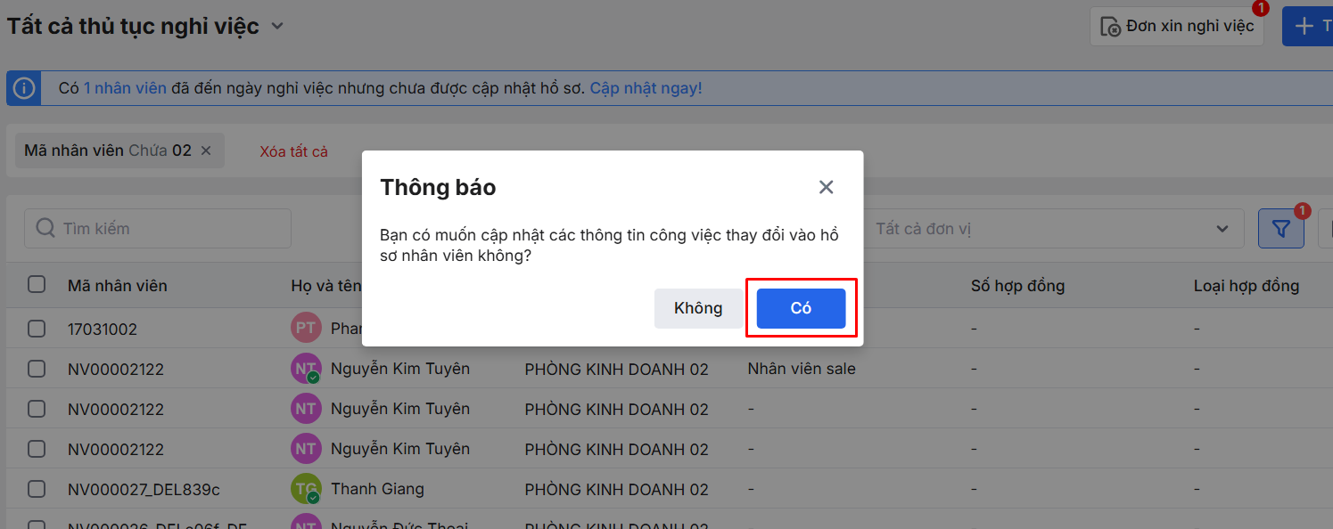 Bước 2: Phần mềm tự động đưa ra thông báo cập nhật trạng thái lao động trong hồ sơ nhân viên\ Nhấn .
