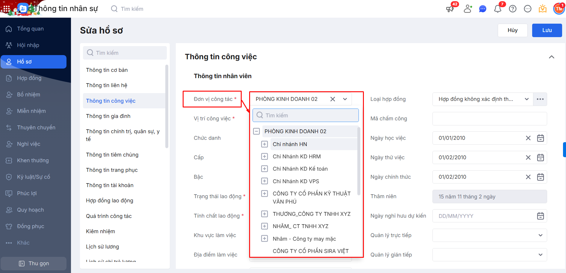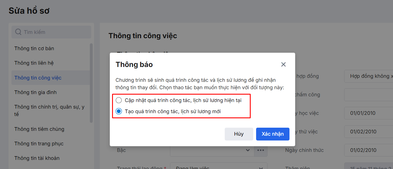 4. Tự động sinh quá trình công tác, lịch sử lương khi thay đổi thông tin công việc (đơn vị công tác) trên hồ sơ nhân viên