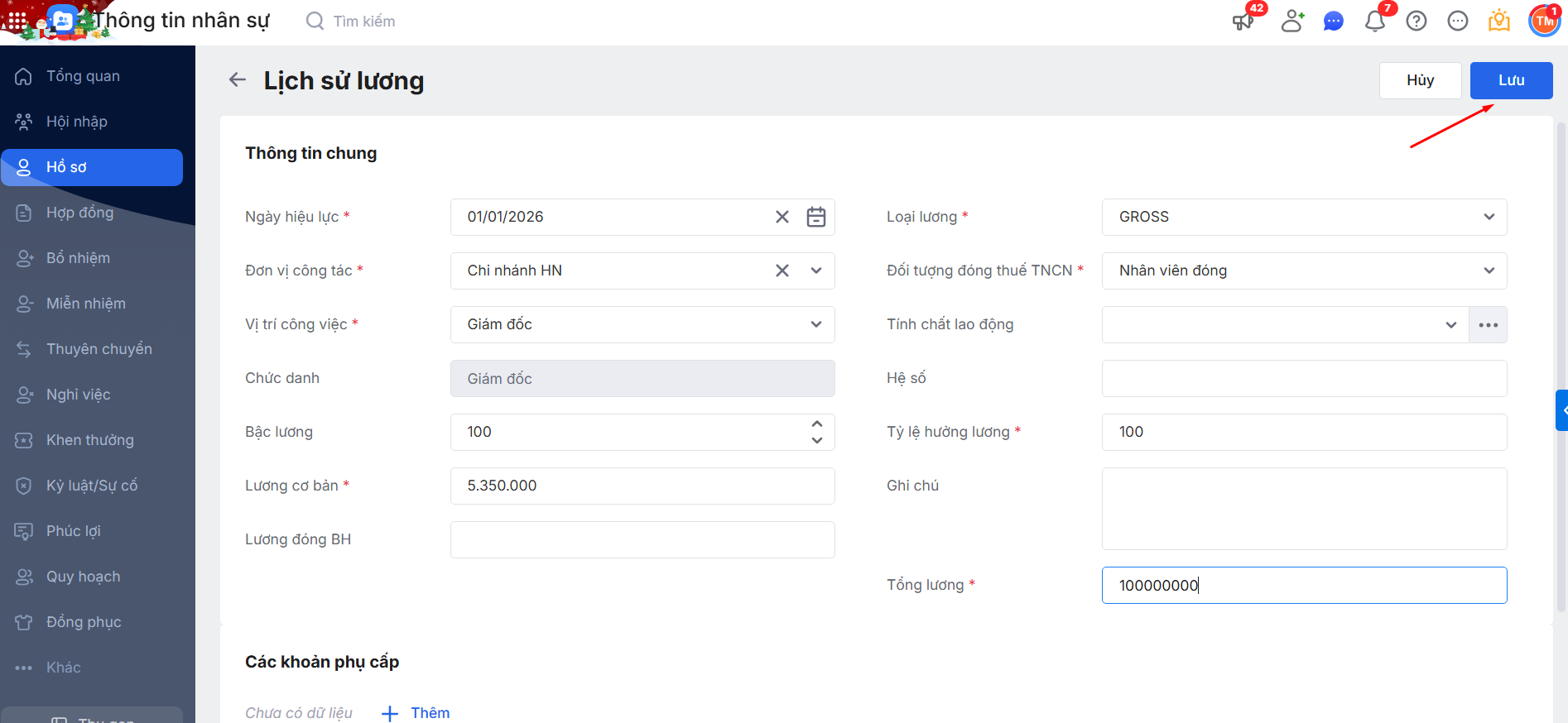 Bước 5: Phần mềm sinh tiếp giao diện Lịch sử lương\ Điền thêm các thông tin con thiếu\ Nhấn Lưu để hoàn thành.
