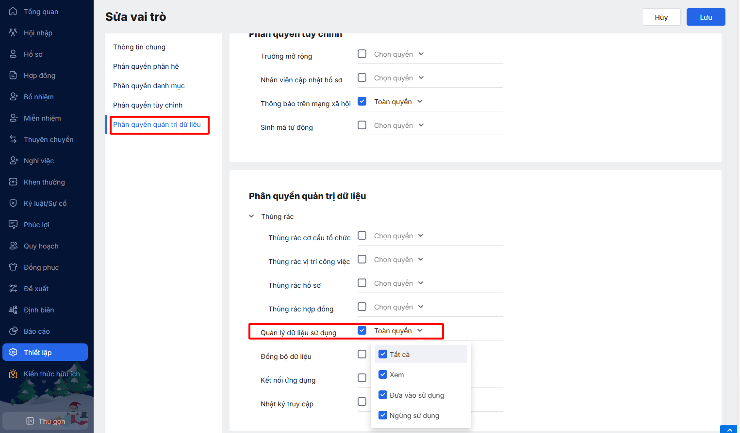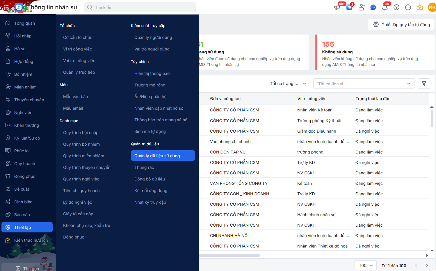 Bước 1: Tại phần mềm thông tin nhân sự, truy cập vào phân hệ Thiết lập\Quản lý dữ liệu sử dụng.