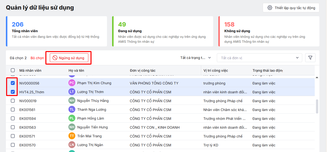 • Cách 2: Tích chọn nhiều nhân viên Ngừng hoặc Đưa vào sử dụng hàng loạt.