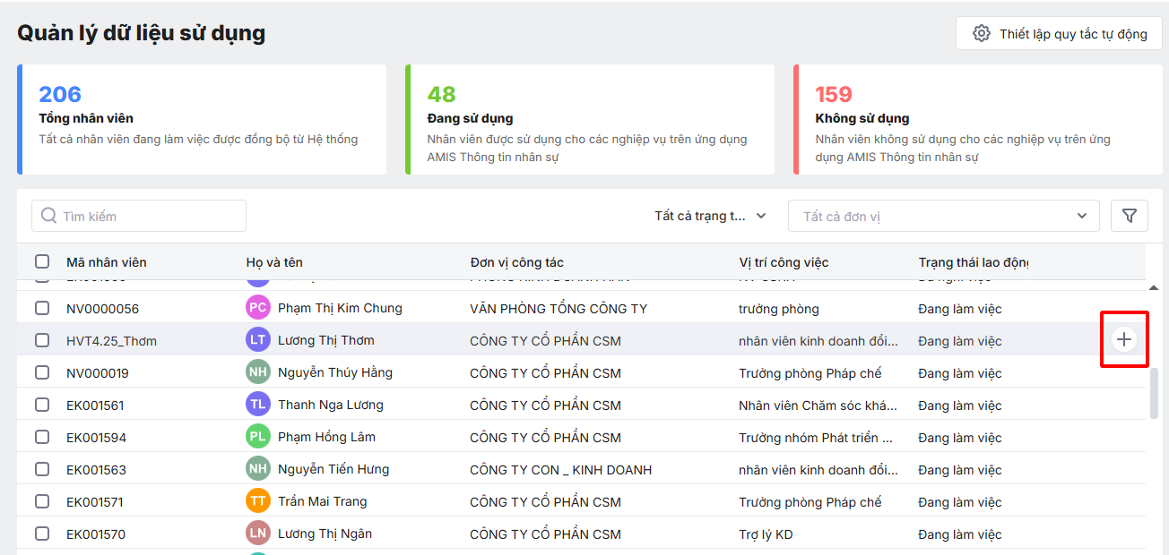 Bước 2: Tại đây hiển thị danh sách tất cả các nhân viên đồng bộ từ AMIS Hệ Thống, chọn danh sách nhân viên sử dụng