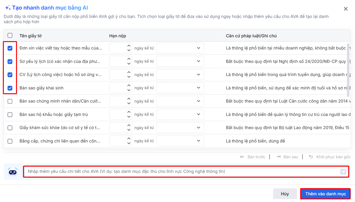 Bước 3: Tích chọn các loại giấy tờ phù hợp để đưa vào sử dụng ngay, hoặc nhập thêm yêu cầu cho AVA để tạo lại danh sách phù hợp hơn.