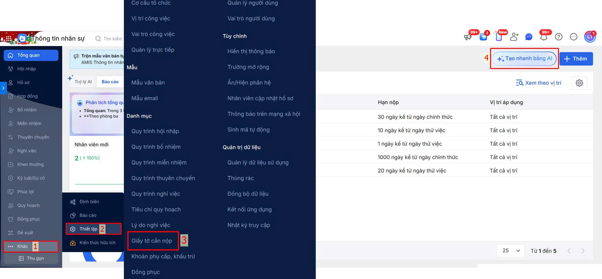 Bước 1: Vào mục Khác \ tại phân hệ Thiết lập \ Danh mục \ chọn Giấy tờ cần nộp \ nhấn Tạo nhanh bằng AI.