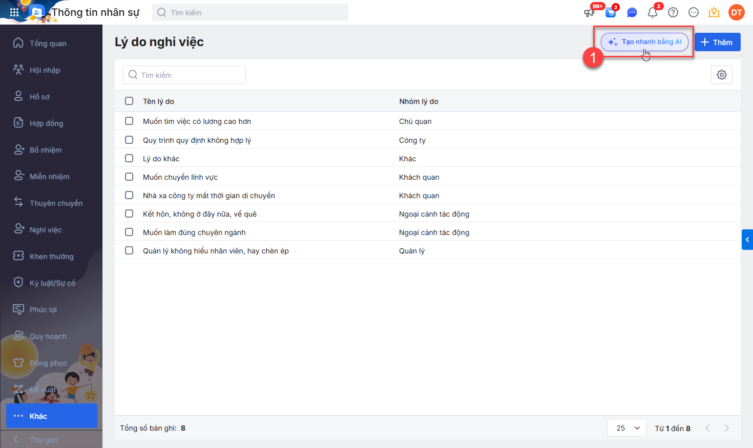 Tại Thiết lập\Danh mục\Lý do nghỉ việc\chọn Tạo nhanh bằng AI.