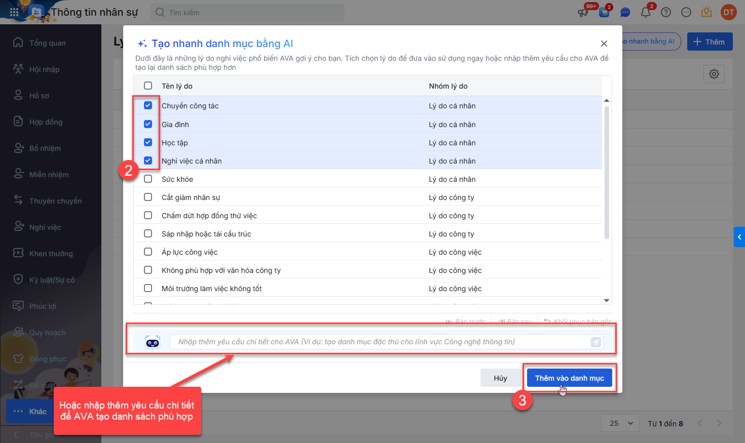 Ngay lập tức, AI sẽ đưa ra danh sách các lý do nghỉ việc phổ biến. Anh/Chị tích chọn các lý do phù hợp để đưa vào sử dụng ngay hoặc nhập thêm yêu cầu cho AVA để tạo lại danh sách phù hợp hơn.
