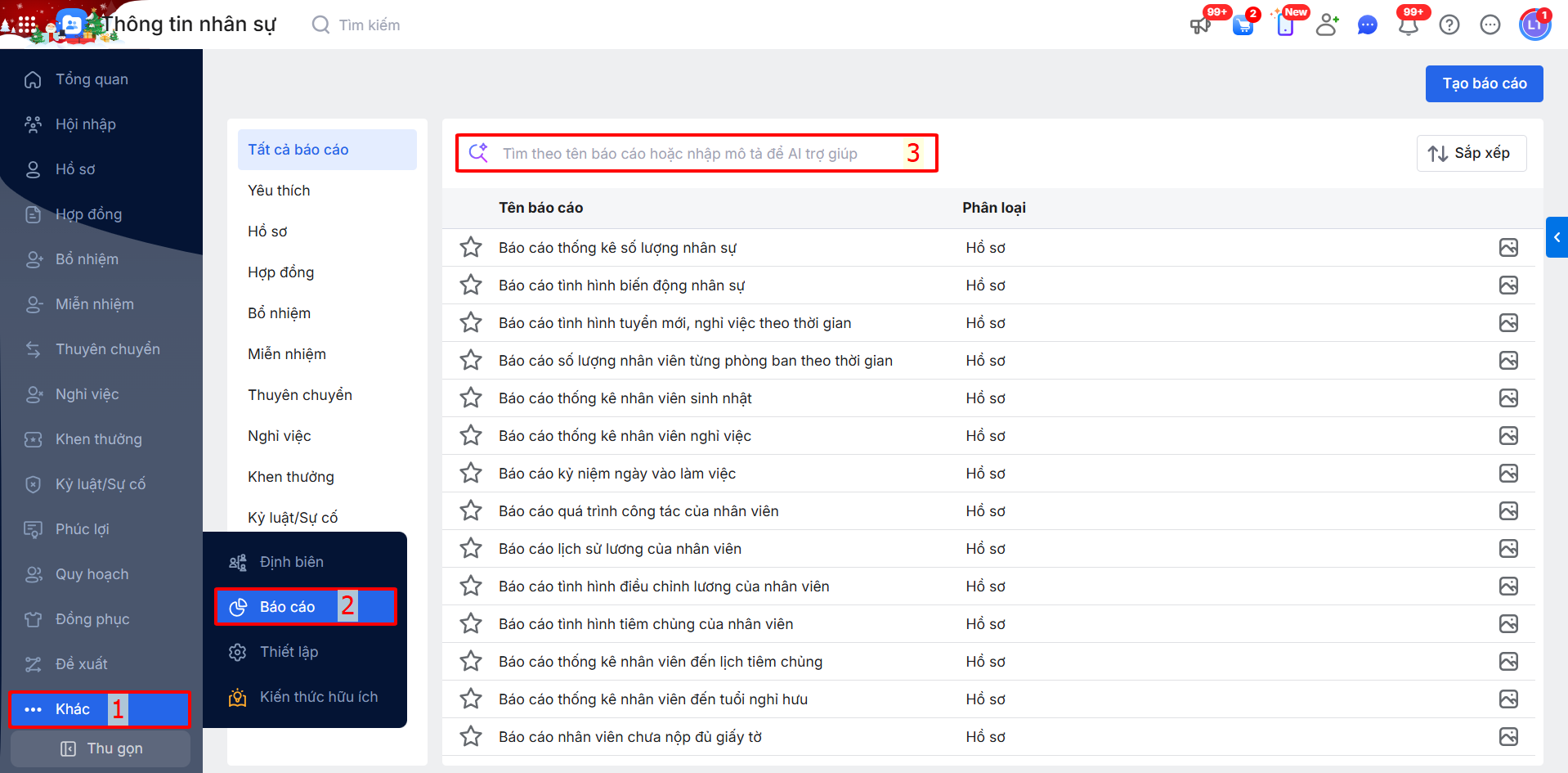 Bước 2: : Nhập tên báo cáo hoặc mô tả \ ngay lập tức AI sẽ hỗ trợ tìm kiếm và đưa ra các gợi ý để lựa chọn \ chọn báo cáo cần xem