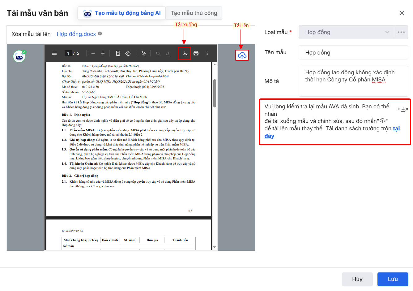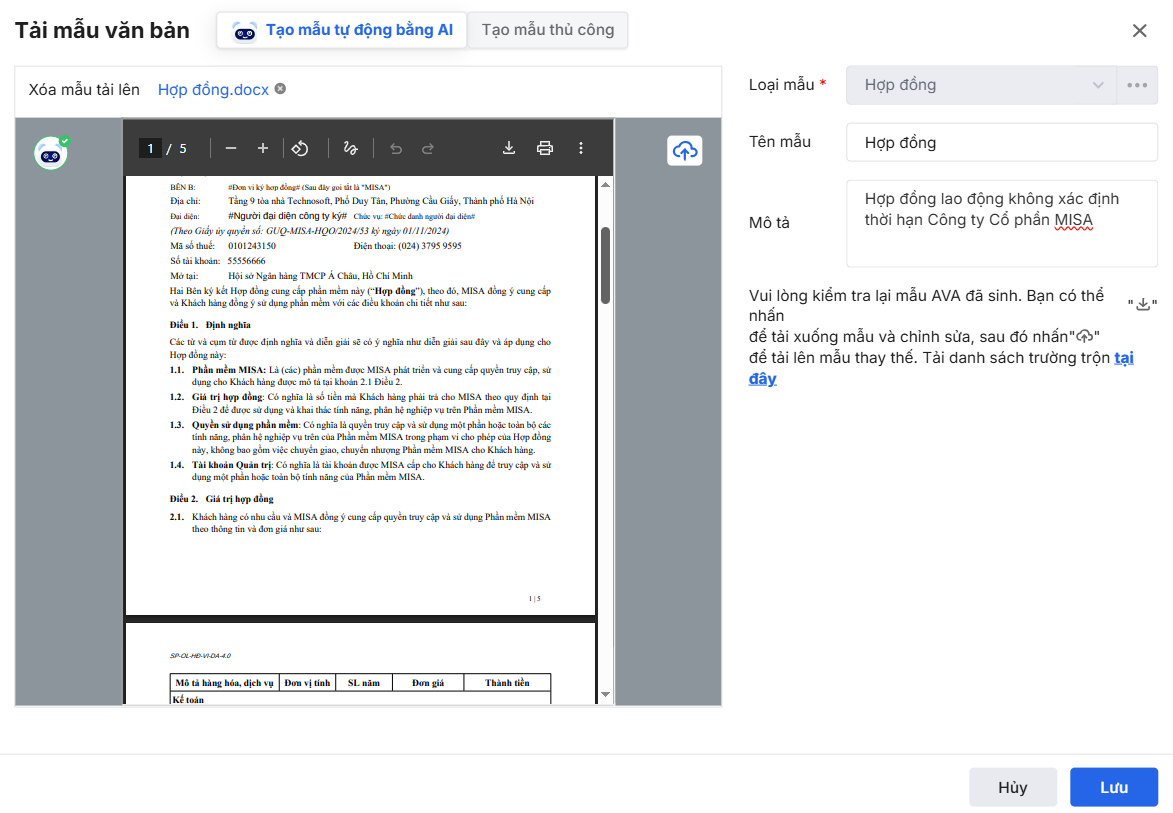 Bước 4: Sau khi tải lên thành công văn bản, kiểm tra lại mẫu văn bản do AVA tự sinh sau đó nhấn Lưu để hoàn thành tạo mẫu.
