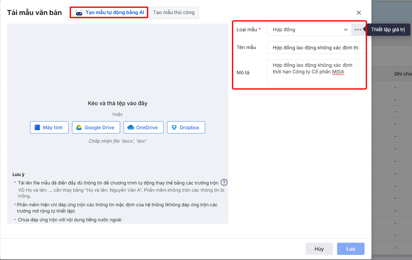 • Tên mẫu: điền tên mẫu văn bản tải lên.
