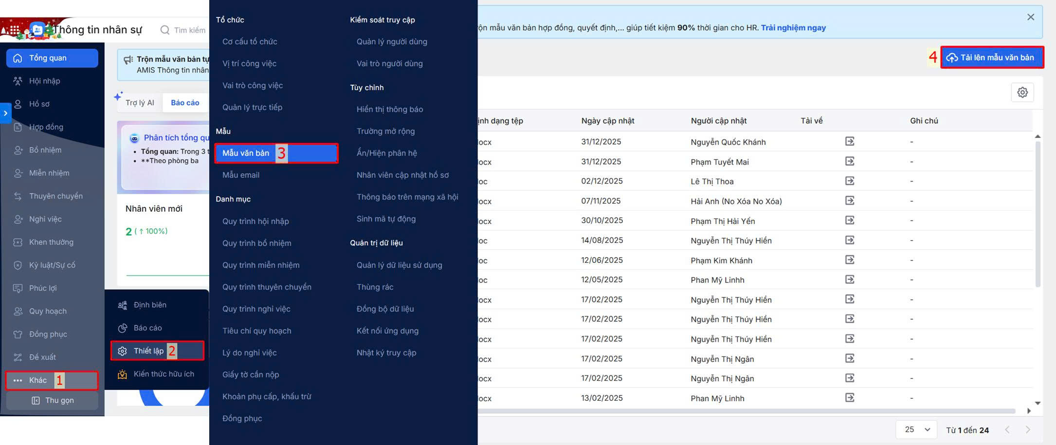 Bước 1: Tại mục Khác \ phân hệ Thiết lập \ Mẫu \ chọn Mẫu văn bản \ nhấn Tải lên mẫu văn bản.