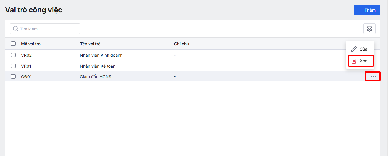 • Xóa Vai trò công việc
