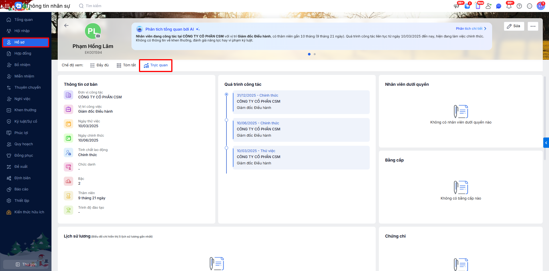 Bước 1: Trên giao diện xem chi tiết hồ sơ của một nhân sự, nhấn vào tab Trực quan