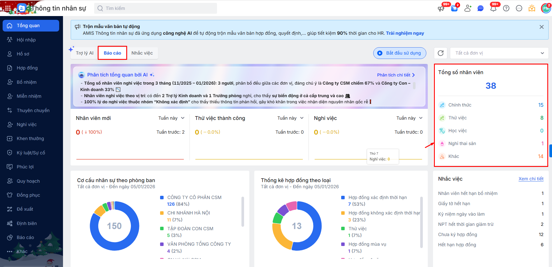 Bài viết hướng dẫn xem chi tiết, đồng thời xuất khẩu dữ liệu tại các chỉ số trên màn hình Tổng quan của AMIS Thông tin nhân sự, nhằm giúp nắm bắt đầy đủ tình hình nhân sự và thuận tiện trong việc tổng hợp, báo cáo.