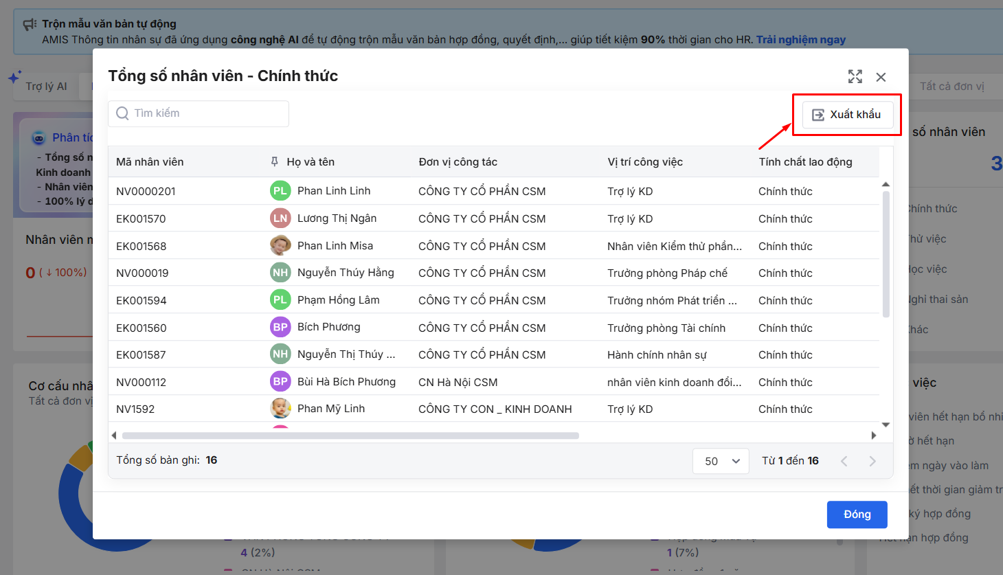 Bước 2: HR có thể xuất khẩu các dữ liệu này ra file excel.
