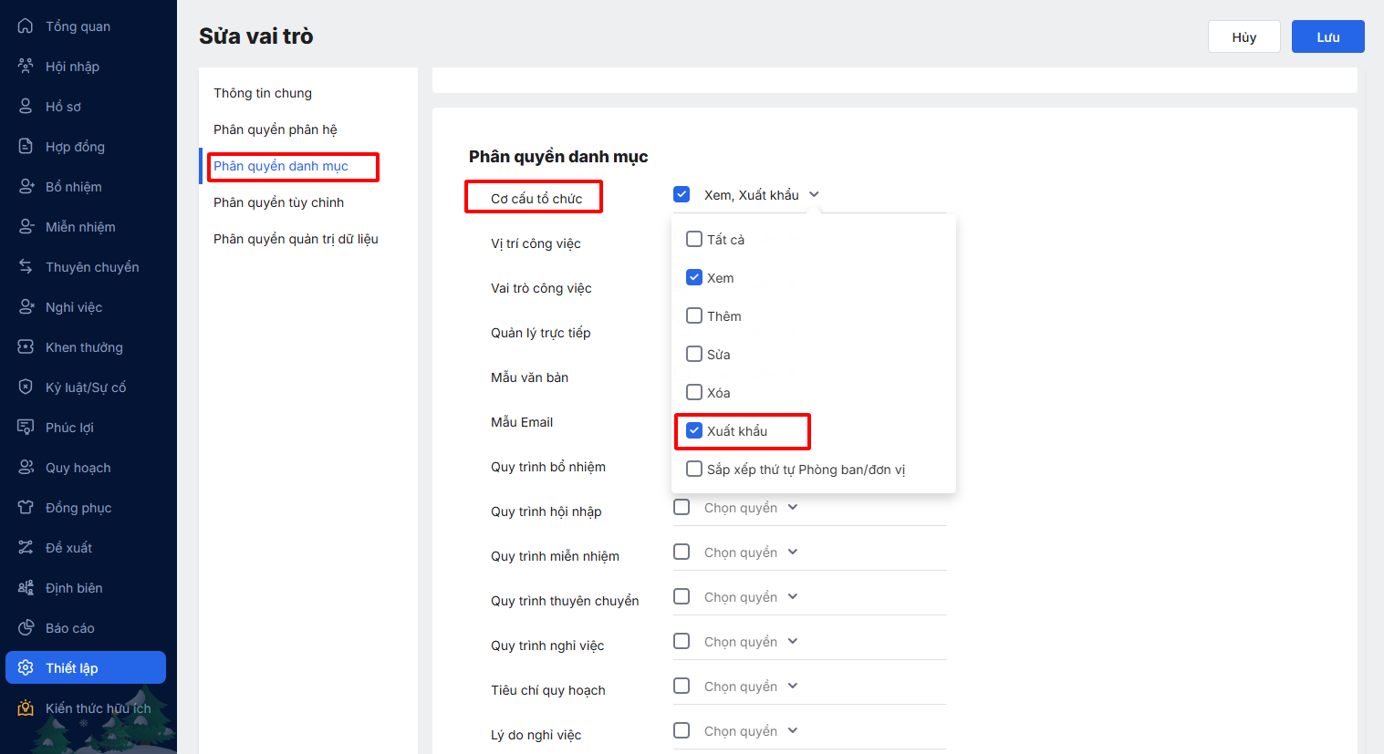 Bước 3: Tại mục Quyền danh mục\Cơ cấu tổ chức, nhấn mũi tên xuống\chọn Xuất khẩu