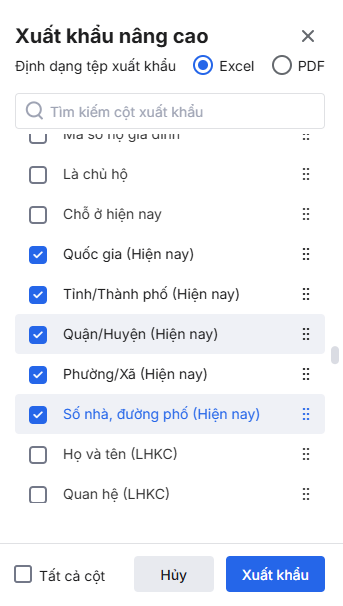Bước 4: Tại giao diện khai báo Xuất khẩu nâng cao, anh chị tích chọn các cột thông tin liên quan đến chỗ ở hiện nay, đã tách riêng theo từng cột xã phường, quận/huyện, tỉnh/thành phố. Nhấn Xuất khẩu