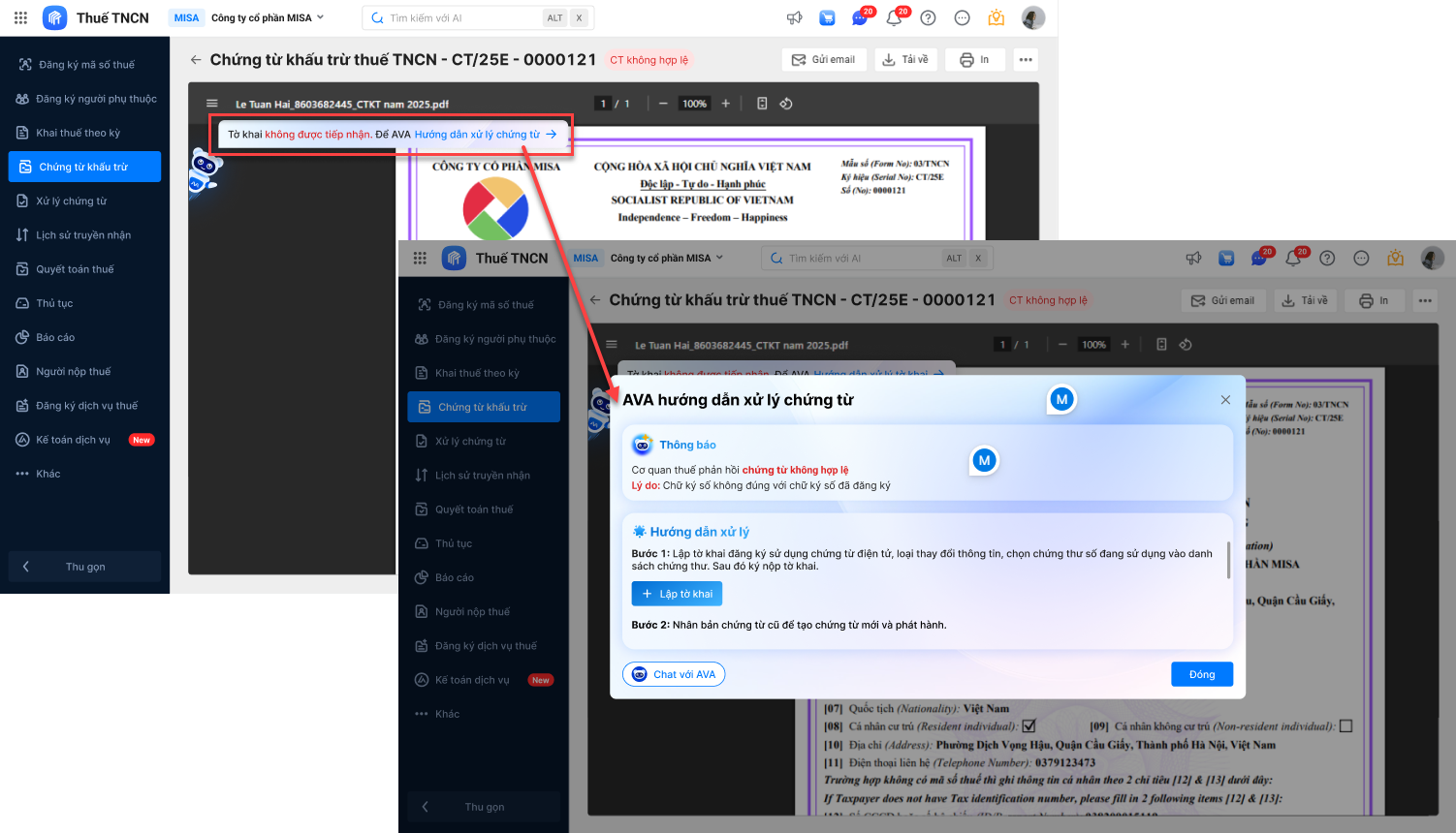 Bài viết giới thiệu tính năng AI giúp hướng dẫn xử lý chứng từ khấu trừ thuế TNCN không hợp lệ, gửi cơ quan thuế thất bại.