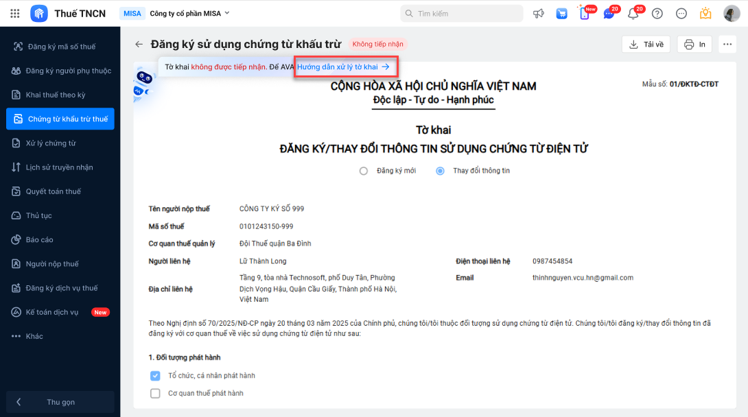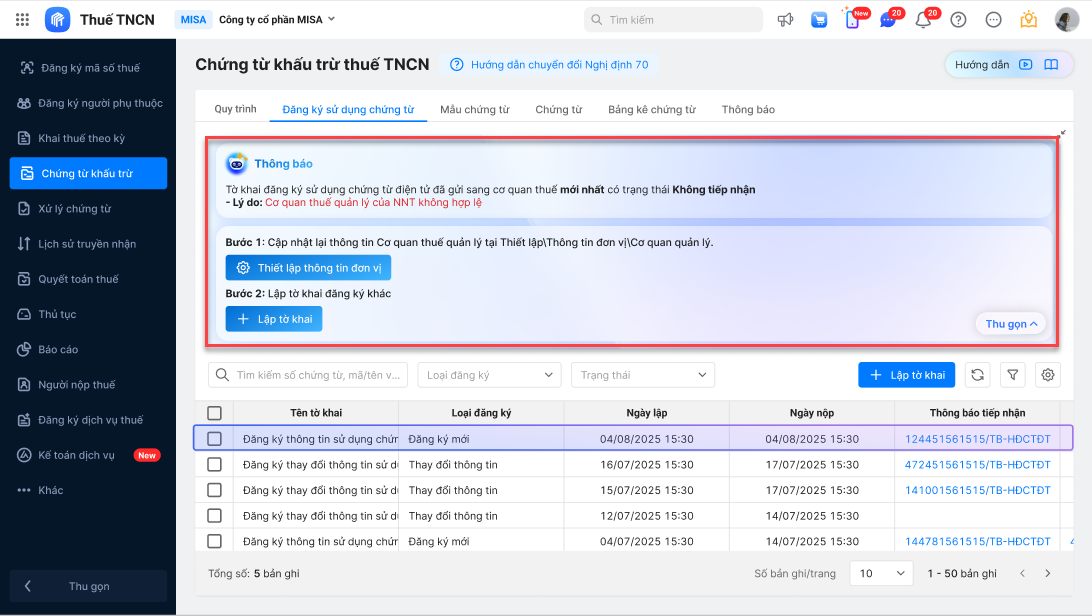 Tại Chứng từ khấu trừ\Đăng ký sử dụng chứng từ: AI tự động phân tích và thông báo tờ khai đăng ký sử dụng chứng từ mới nhất có trạng thái không tiếp nhận và lý do. Đồng thời hướng dẫn các bước xử lý.