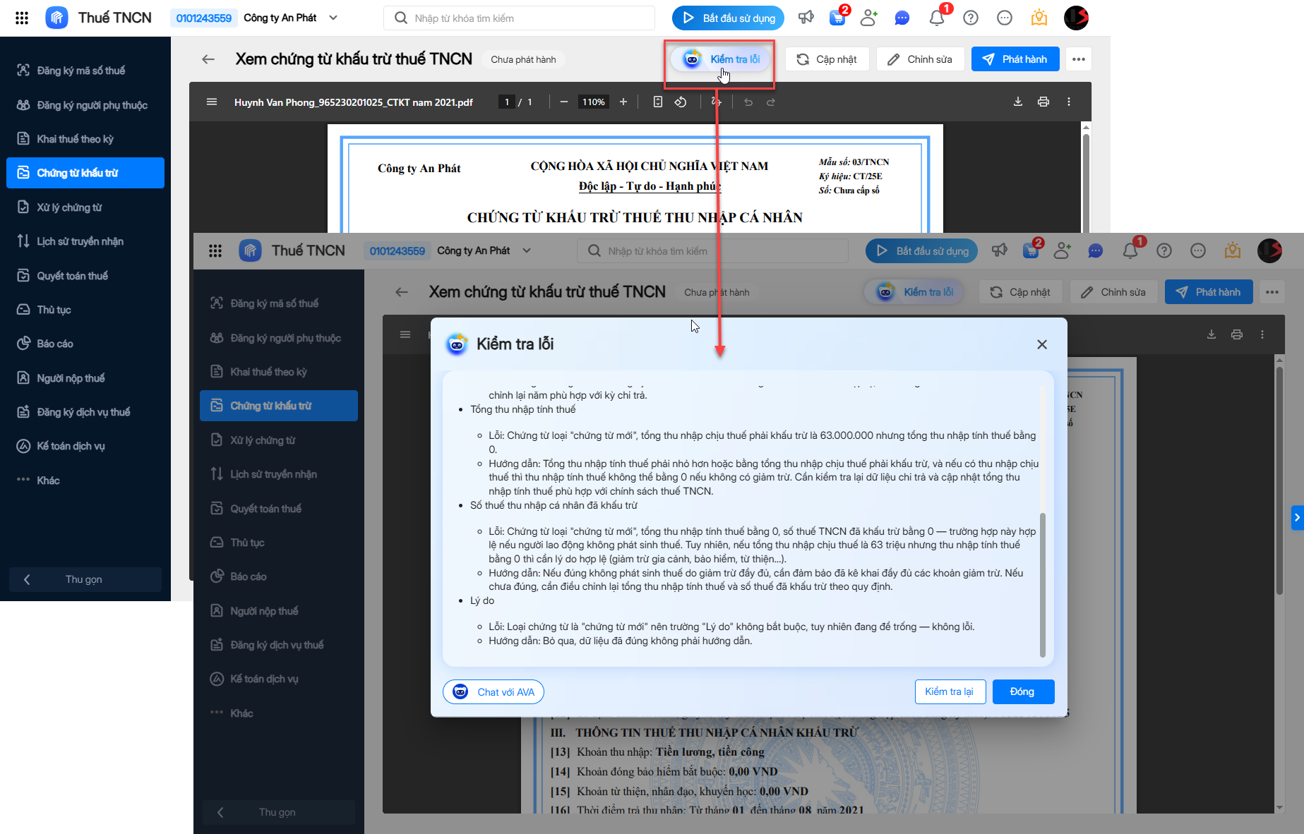 Bài viết giới thiệu tính năng AI giúp kiểm tra và hướng dẫn xử lý lỗi khi lập chứng từ khấu trừ thuế TNCN.
