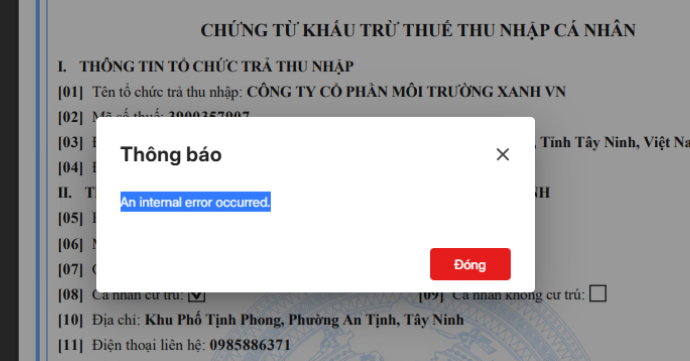 9. Ký phát hành báo lỗi “An internal error occurred”