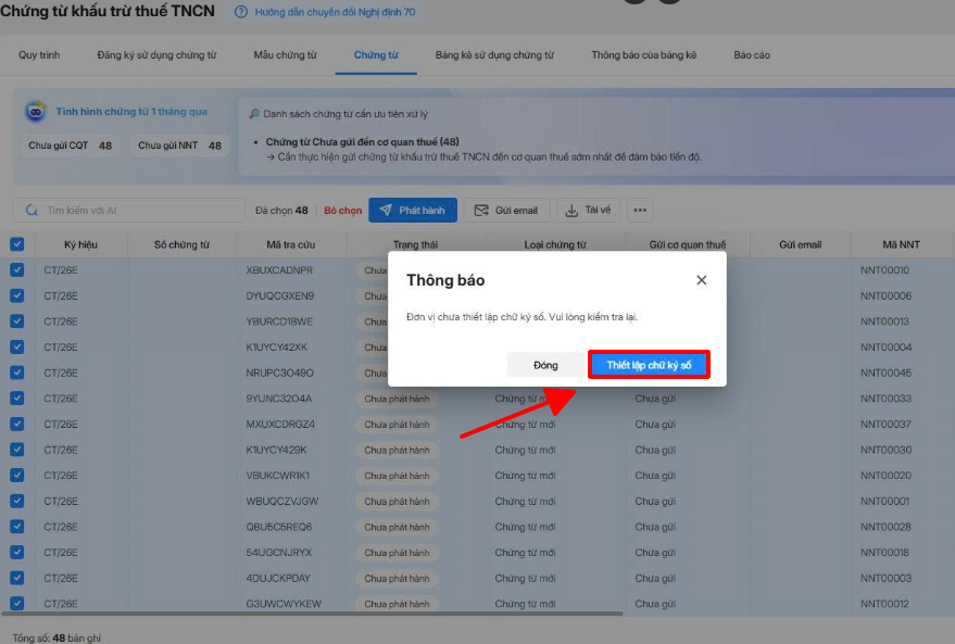 10. Ký phát hành báo lỗi “Đơn vị chưa thiết lập chữ ký số, vui lòng kiểm tra lại”