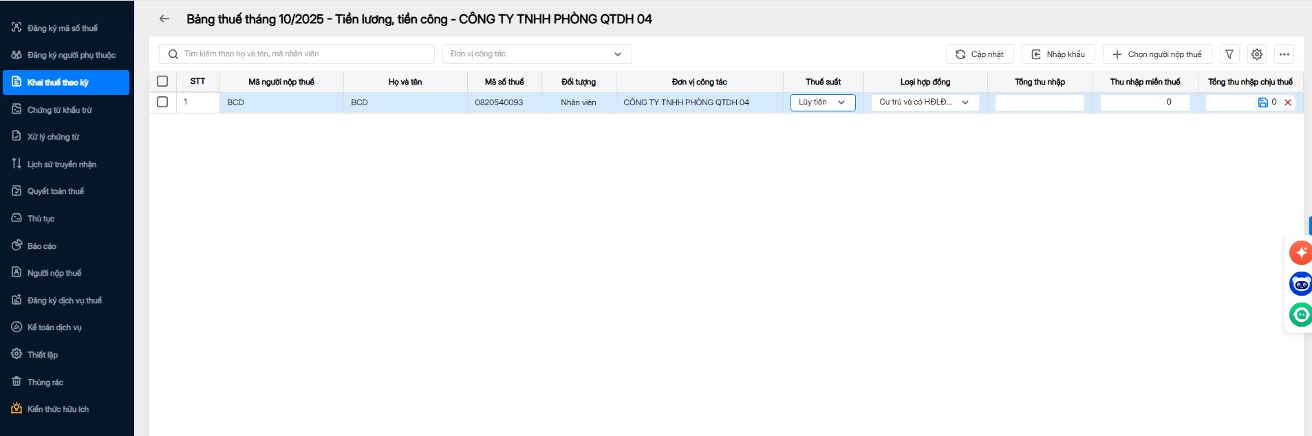 | Số người phụ thuộc | Nếu thuế suất là “Lũy tiến”: phần mềm tự động tổng hợp số NPT là tổng số thành viên gia đình được tích là người phụ thuộc và có thời gian giảm trừ thuộc kỳ tính thuế (có ít nhất 1 tháng nằm trong kỳ tính thuế) trên hồ sơ người nộp thuế. | |