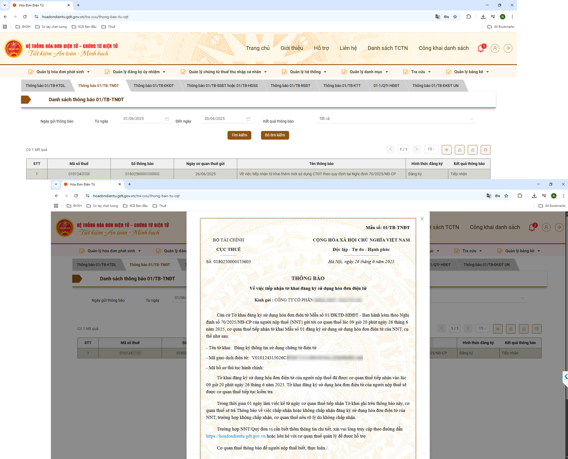 - Vào Tra cứu\Thông báo từ CQT, Chọn Thông báo 01/TB-TNDT, lọc ngày tra cứu và nhập đầy đủ các thông tin bắt buộc (dấu *) rồi bấm Tìm kiếm. Kết quả trả ra các tờ khai đã đăng ký với Cơ quan thuế trong khoảng thời gian và phạm vi tra cứu.