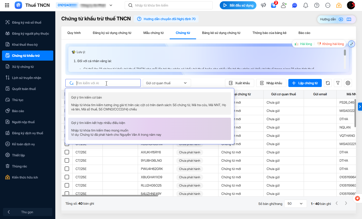 Bài viết giới thiệu tiện ích gợi ý tìm kiếm chứng từ khấu trừ thuế TNCN khi sử dụng Tìm kiếm với AI.