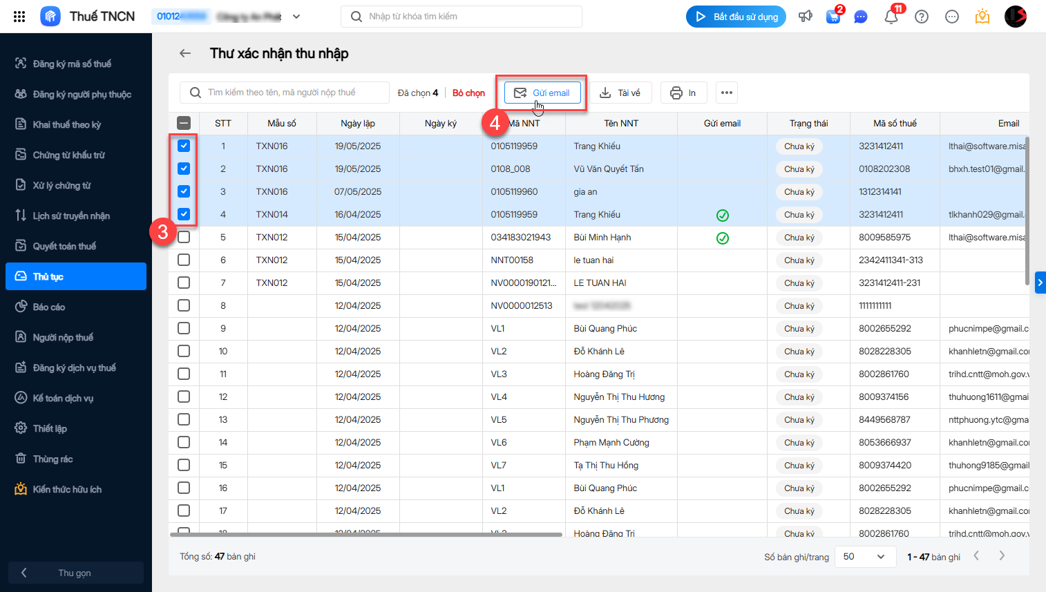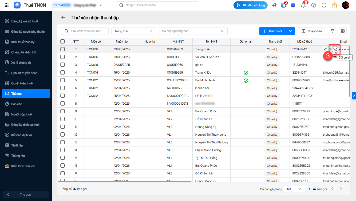 Cách 1: Tại danh sách chứng từ khấu trừ, click vào biểu tượng tại cột Gửi email