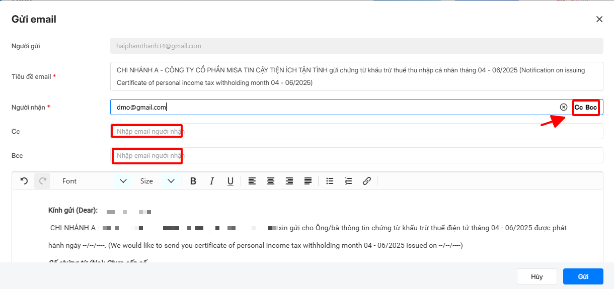Trường hợp đơn vị muốn gửi email dạng Cc hoặc Bcc cho người khác, có thể nhấp vào mục Cc hoặc Bcc và nhập địa chỉ email người nhận.