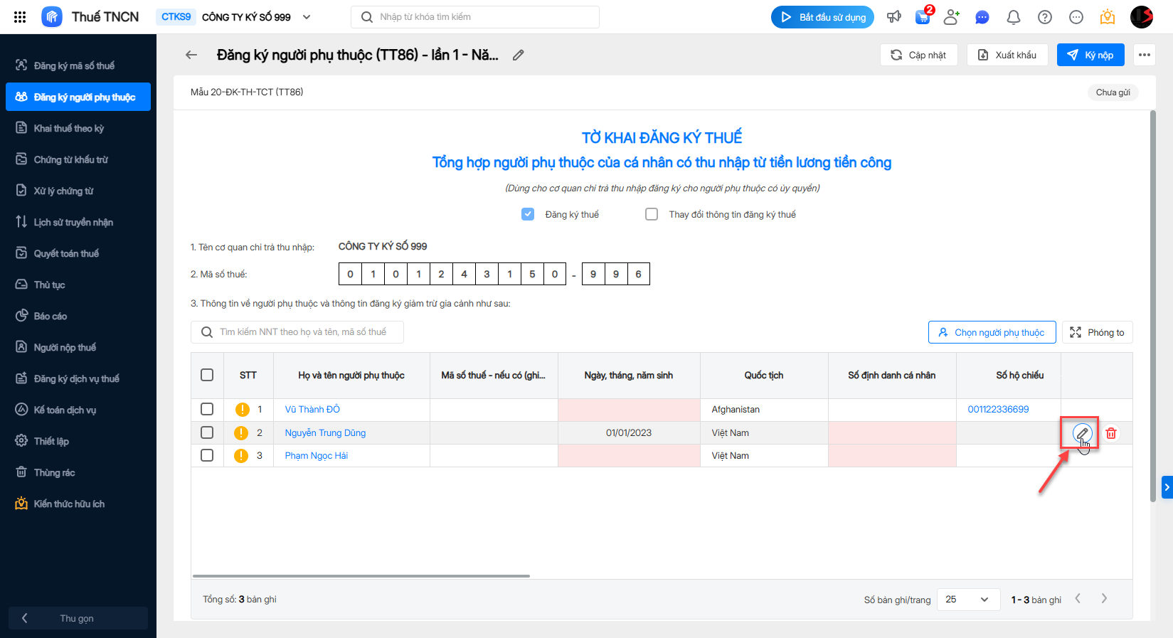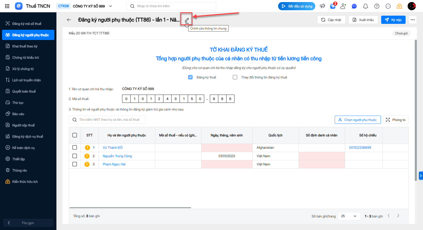 Lưu ý 1: Trường hợp thông tin người phụ thuộc thiếu, nhấn Chỉnh sửa để bổ sung thông tin trực tiếp tại dòng.