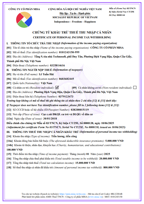 Hướng dẫn đơn vị điền các chỉ tiêu trên chứng từ điều chỉnh khi phát hiện chứng từ khấu trừ thuế TNCN đã phát hành nhưng sai thông tin.