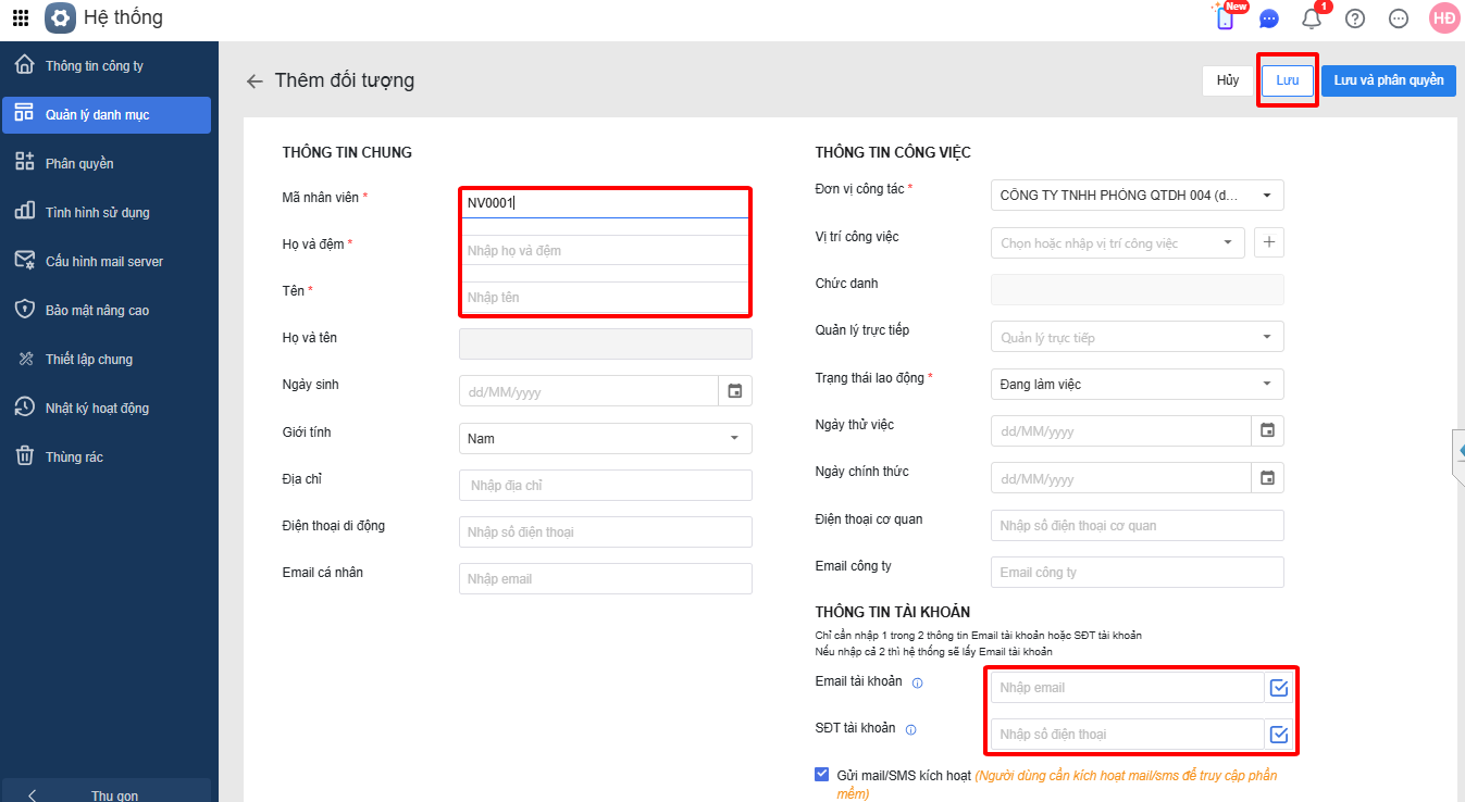 • Tại cửa sổ thêm đối tượng, khai báo thông tin bắt buộc -> và Lưu để ghi nhận lên ứng dụng