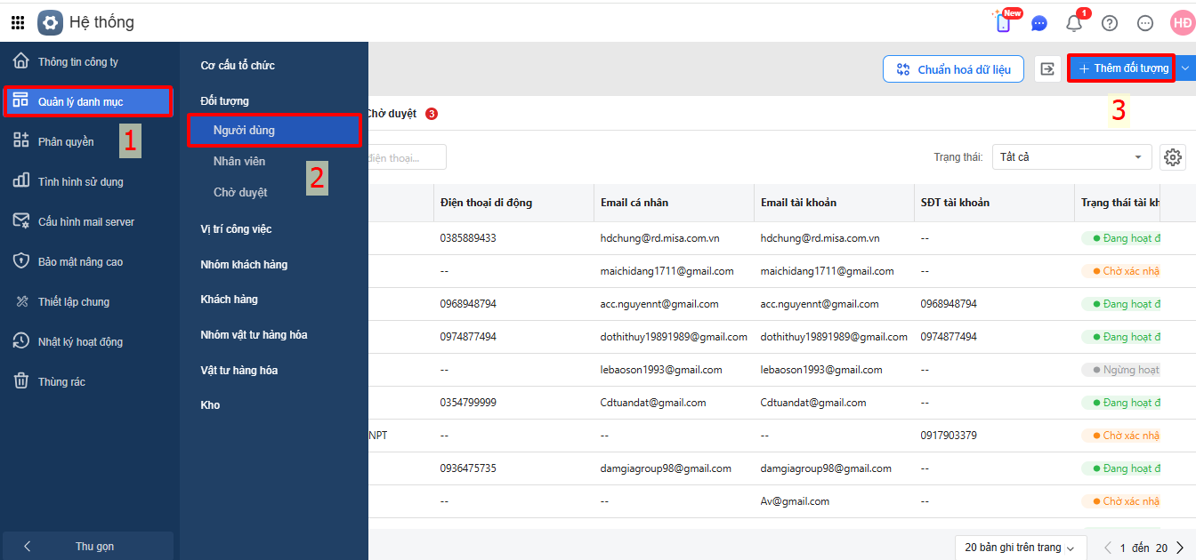 Sau khi nhấn Lưu, người dùng sẽ được thêm vào Hệ thống ở trạng thái Chờ xác nhận. Đồng thời, Hệ thống sẽ gửi cho người dùng 1 email để yêu cầu xác nhận tài khoản.