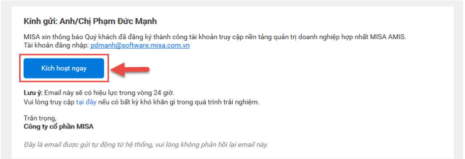• Người được phân quyền truy cập vào email đã đăng ký tài khoản MISA AMIS và thực hiện xác nhận theo hướng dẫn trong email để hoàn thành phân quyền.
