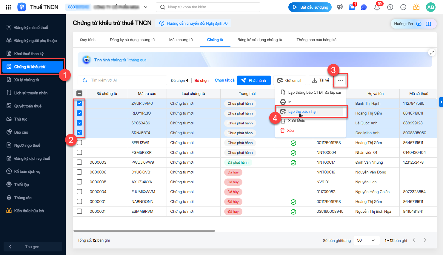 - Tích chọn những người nộp thuế cần lập thư xác nhận\nhấn Tiếp tục