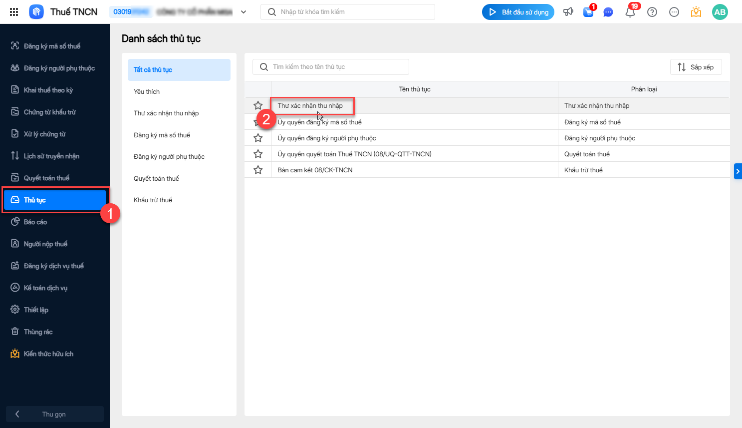 - Tại Thủ tục\chọn Thư xác nhận thu nhập.
