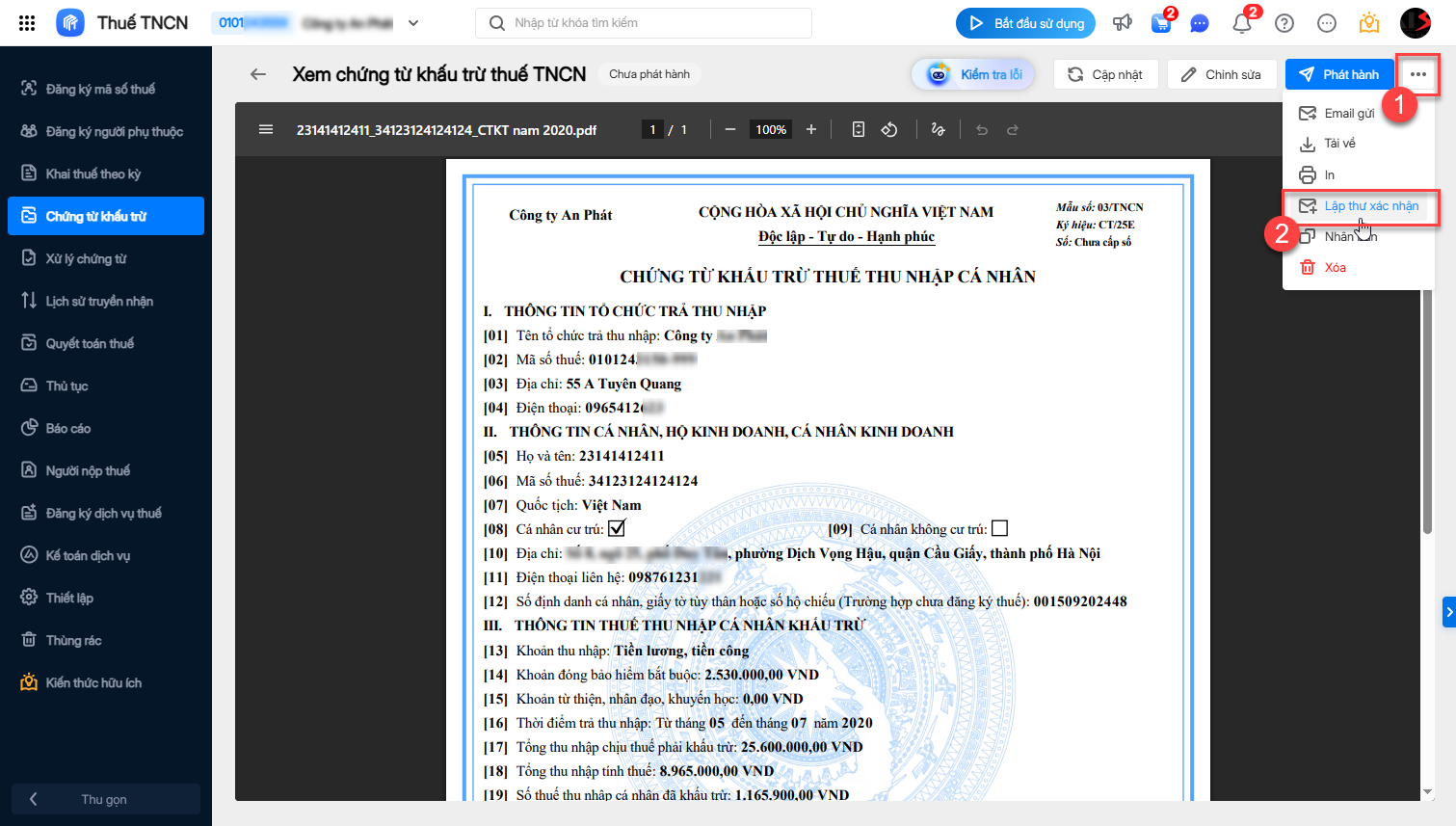 Mục đích: Bài viết giới thiệu quy trình lập, ký điện tử và in hàng loạt thư xác nhận thu nhập cho nhân viên nghỉ việc, đối tượng vãng lai tự quyết toán thuế.