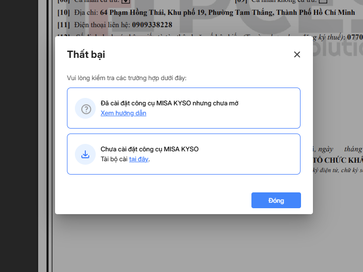 Biểu hiện: Khi thực hiện ký nộp, hệ thống sẽ cảnh báo: Thất bại, vui lòng kiểm tra công cụ MISA KYSO