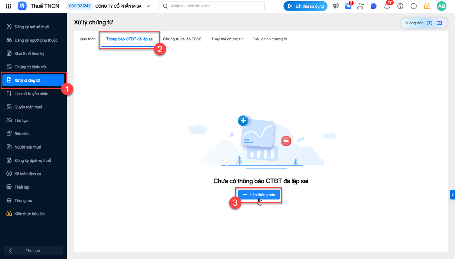 Tại Xử lý chứng từ\Thông báo chứng từ điện tử đã lập sai\nhấn Lập thông báo.