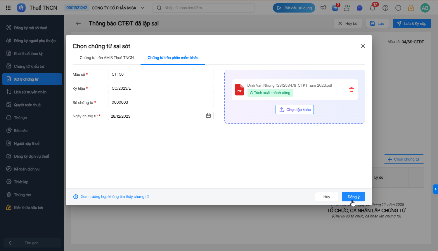 AI sẽ trích xuất các thông tin chứng từ bao gồm mẫu số, ký hiệu, số chứng từ, ngày chứng từ để điền vào thông báo.