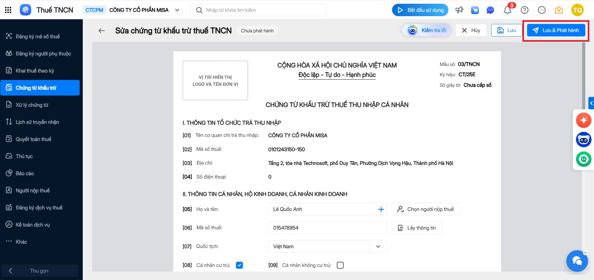 Bước 3: Phát hành chứng từ khấu trừ
