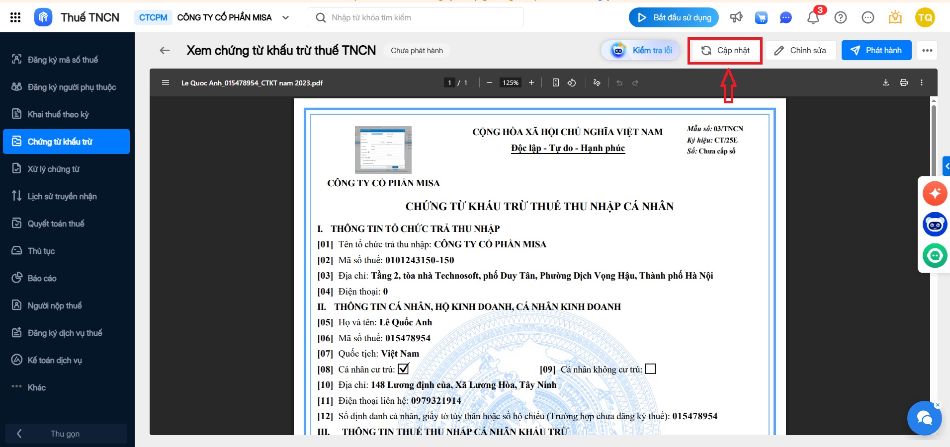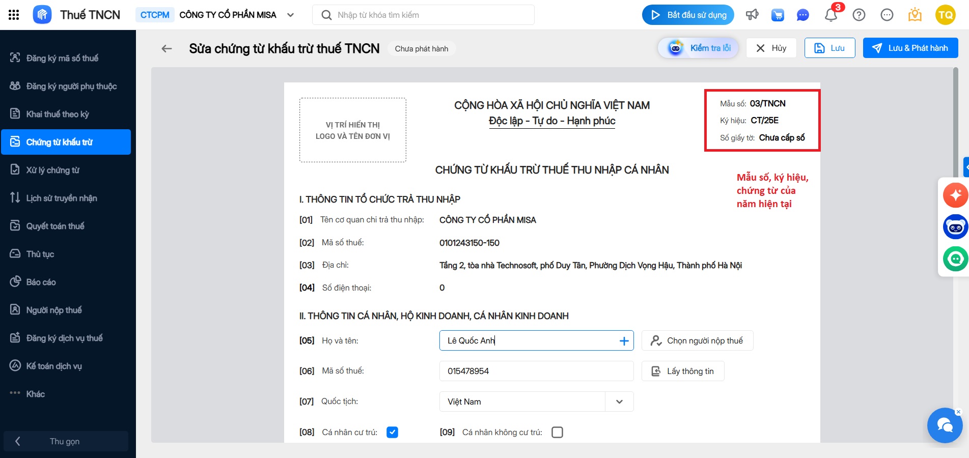 3. Phát hành chứng từ khấu trừ thuế trên phần mềm AMIS Thuế TNCN