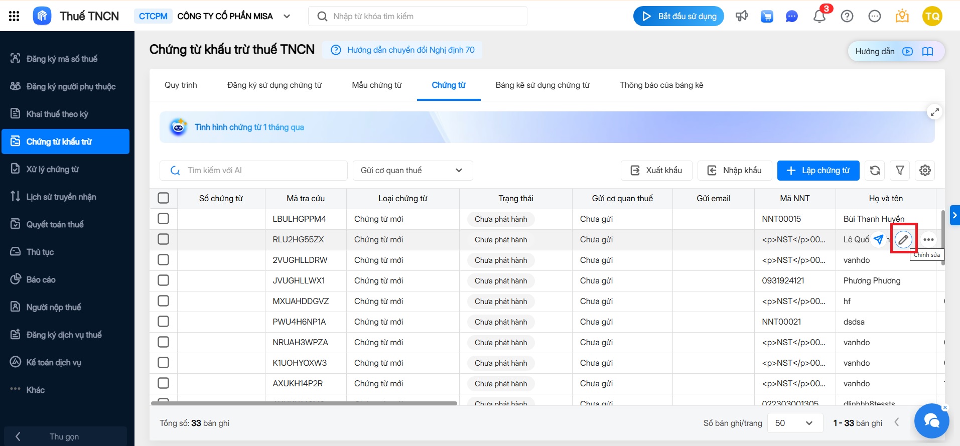Cách 2: Tại danh sách chứng từ, nhấn Chỉnh sửa nếu cần cập nhật thông tin khác. Khi đó hệ thống sẽ cập nhật theo mẫu chứng từ đang phát hành của năm hiện tại.
