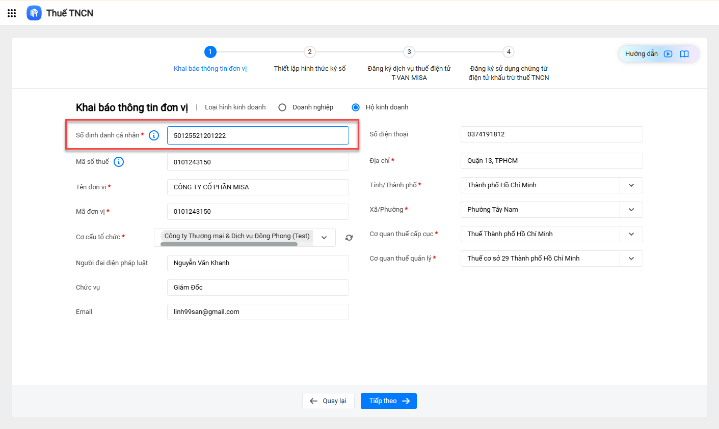 Nhập mã số thuế, mã số thuế đơn vị là hộ kinh doanh theo số định danh cá nhân
