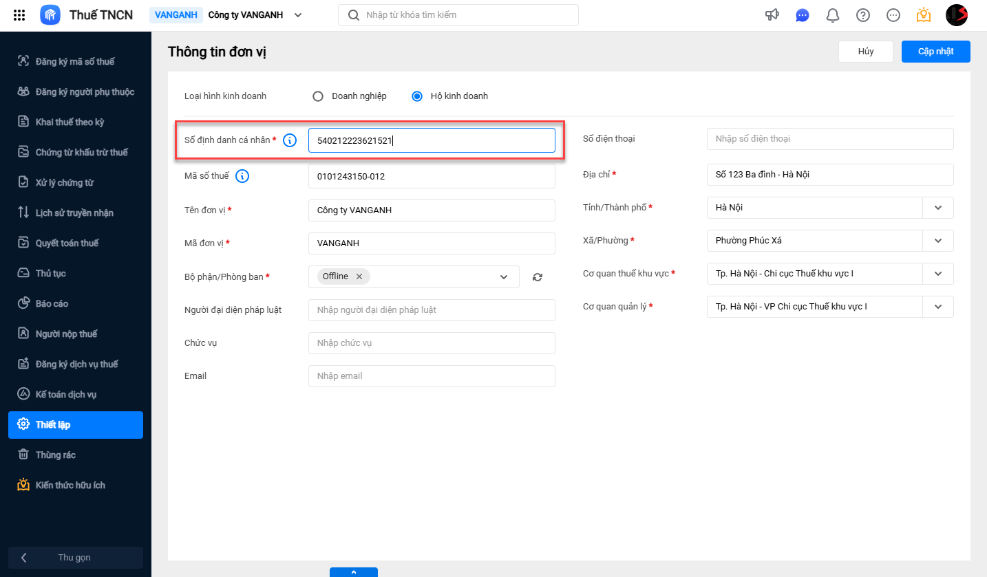 2. Khai báo thông tin đơn vị tại Thiết lập thông tin đơn vị