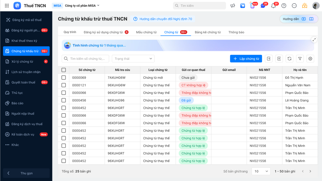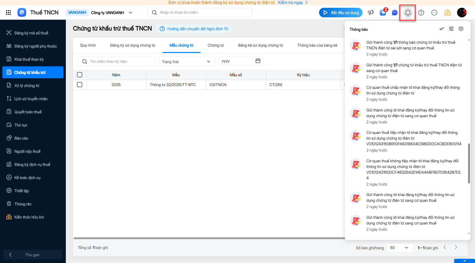 Tại quả chuông thông báo: hiển thị thông báo liên quan đến chứng từ khấu trừ và xử lý chứng từ đối với người lập chứng từ/tờ khai đăng ký/thông báo chứng từ điện tử đã lập sai.
